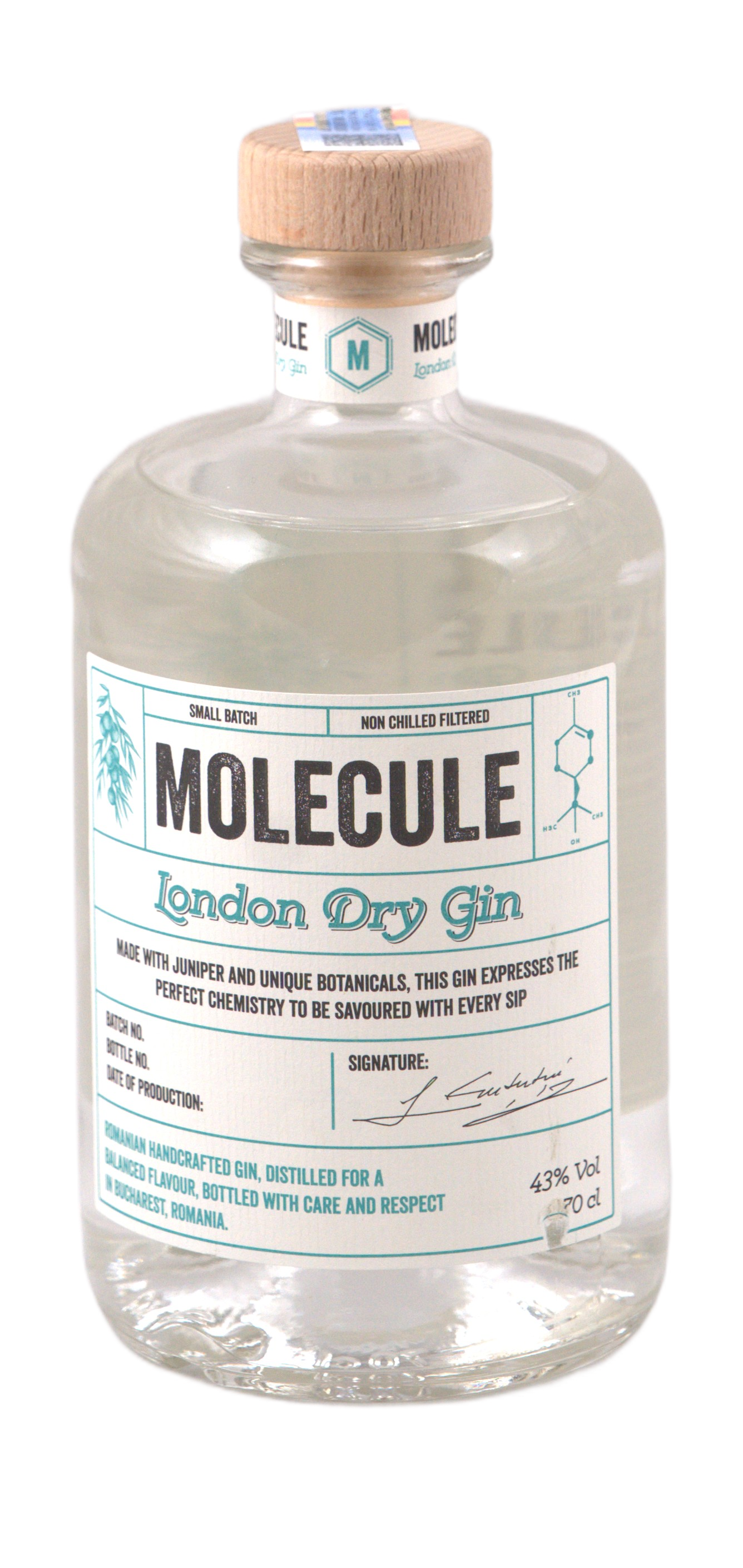 Molecule Gin este un gin artizanal, distilat în loturi mici, realizat din alcool neutru de cereale și un amestec echilibrat de plante botanice naturale. Stilul său modern păstrează claritatea unui London Dry, cu accente florale și citrice distinctive. Ginul este dezvoltat în parteneriat cu Jamie Baxter, într-o colaborare care reflectă o viziune comună asupra preciziei, purității și expresiei aromatice.